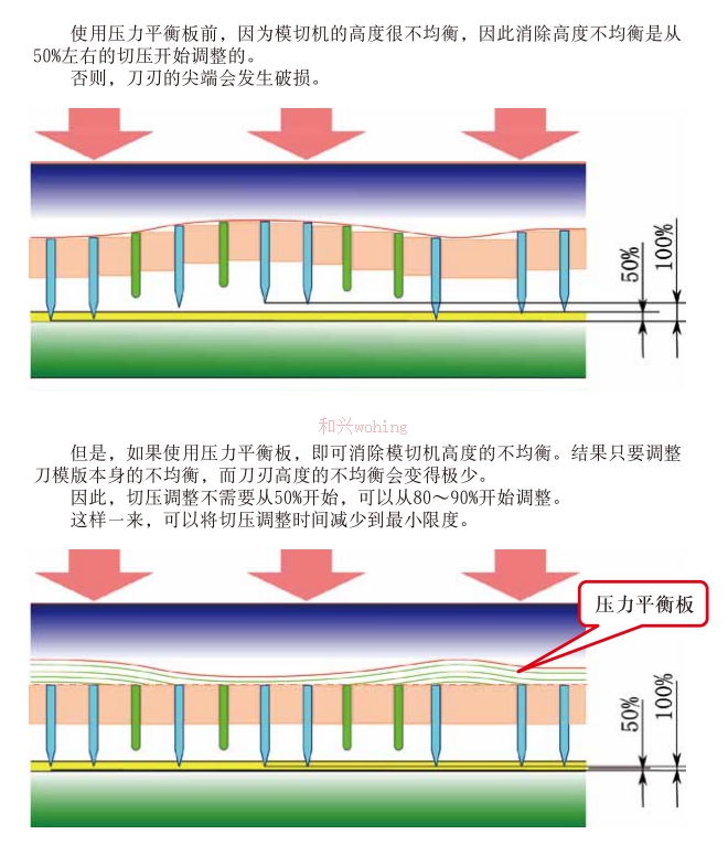 主要用于平衡老舊模切機(jī)模切平臺(tái)不平整的產(chǎn)品,日本提供的產(chǎn)品和工藝。其原理是由于平壓平模切機(jī)平臺(tái)不平衡,造成用鋼模模切0.2毫米的平衡補(bǔ)壓板形成不同層數(shù)的切透和切不透的位置,撕掉完全切透的方塊(50毫米X50毫米),粘合上下兩層蓋板,最后替換現(xiàn)有模切板背面的蓋板。